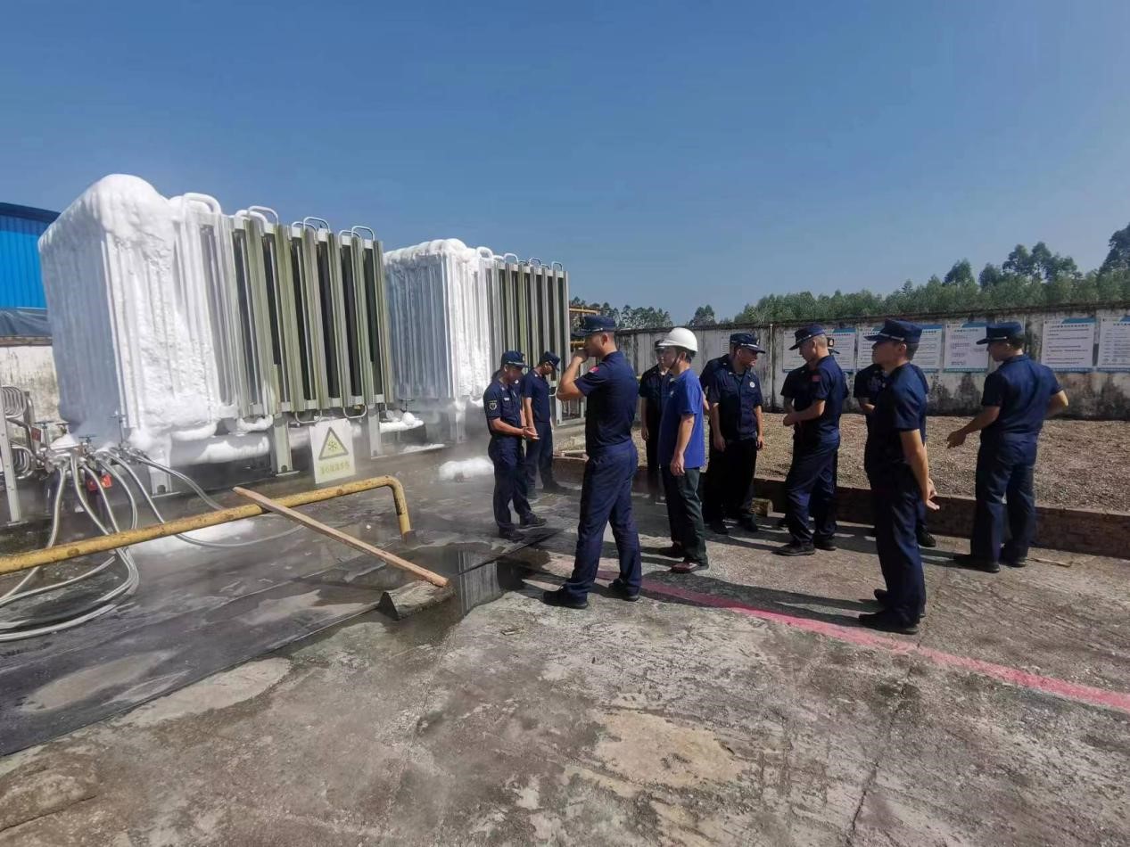 熊飛一行首先聽取了廣西鄂中安環處處長崔樹勤關于近幾月公司日常消防工作情況的匯報,了解了公司消防工作的成果及重難點工作。隨后,指導組對公司各類消防基礎臺帳、消防檢查記錄等情況逐一詳細檢查和了解。在安環處處長的陪同下,指導組先后來到公司氨站、天然氣站、鍋爐等區域,實地查看排查電氣線路、消防器材、消防疏散通道、安全出口等落實情況和風險隱患。