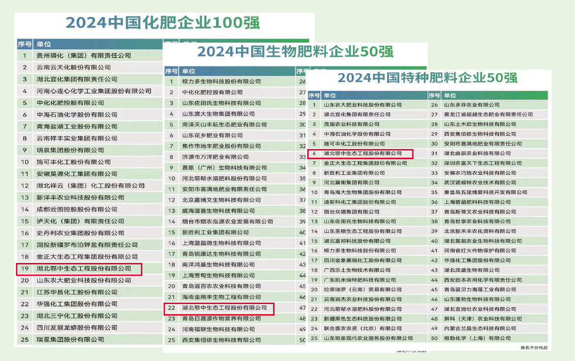 此次活動匯聚國內外眾多知名專家學者、行業協會領導以及化肥行業的優秀企業代表,共同探討化肥產業的發展趨勢,并正式揭曉“2024中國化肥企業100強”等重要榜單。鄂中生態憑借其卓越的業績、先進的技術以及良好的市場口碑,成功入選“2024中國化肥企業100強”榜單,同時榮獲“2024中國生物肥料企業50強”和“2024中國特種肥料企業50強”的殊榮。