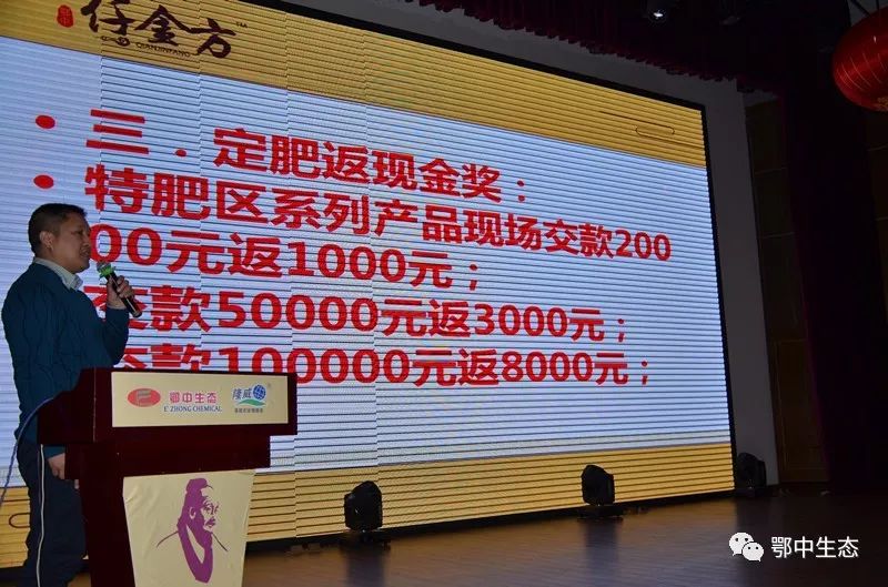 2018年1月16日,湖北鄂中生態工程股份有限公司(下稱“鄂中生態”)在山東臨沂沂南縣,攜手經銷商隆威農業生產資料有限公司開啟首屆高端零售商高峰論壇會議,以打造鄂中仟金方百縣千噸市場為驅動,以“品牌+會銷+技術+服務”逐鹿華北大終端市場,打造起第一塊樣板市場,搶占華北地區零售商大終端首戰告捷:現場訂購鄂中仟金方微生物生態復合肥492噸,微生物菌劑270噸,微生物生態水溶肥21噸,常規復合肥865噸,共計達1648噸。