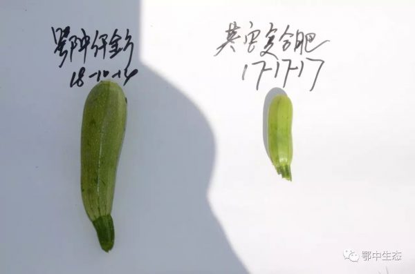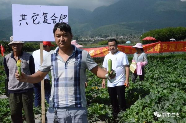 示范戶建光現場用事實說話:7月24日,我在1.2畝西葫蘆田里,其中0.6畝施用鄂中仟金方42%(18-10-14)做基肥25公斤,其中0.6畝地施用其他品牌復合肥(17-17-17)硫酸鉀做基肥35公斤。西葫蘆屬矮生品系,目前處于開花坐果期。示范田從整體長勢,開花坐果效果都非常明顯!葉片與對照田相比,長勢旺但不徒長,葉片寬大且濃綠,葉柄粗壯,葉片無病斑,無葉落枯黃,無一死苗;而對照田西葫蘆葉片暗綠無光,葉片窄小,出現小面積死苗;示范田植株密度1900株,對照田植株密度只有1700株,示范田植株高度和整齊度明顯強于對照田;莖稈圓且粗壯,主蔓粗短,側蔓少,花梗粗壯,開花多,花絲更長;雌雄同株授粉率高,雄花單生旺;開花后,幼瓜黃萎少,而對照田幼瓜黃萎多,示范田少打1-3次藥,省工省時,預測增產15%左右。
