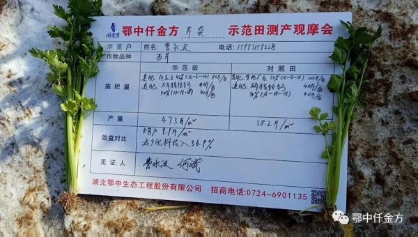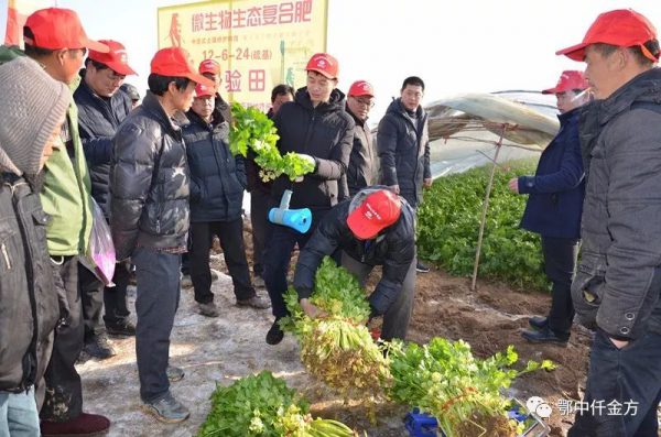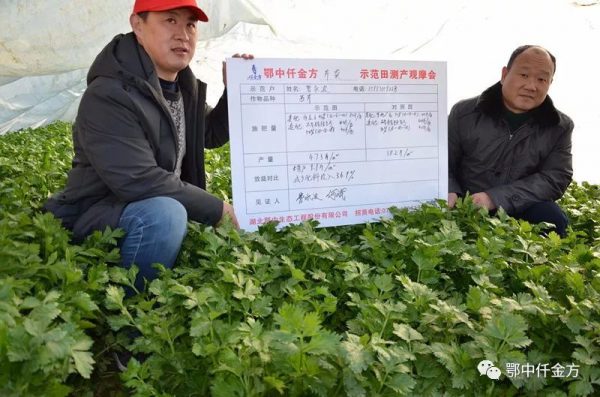 早7:30,測產(chǎn)觀摩現(xiàn)場已經(jīng)彩旗飄飄,鄂中智慧農(nóng)化音響服務車視頻音響傳播在新野縣蔬菜基地,上午八點現(xiàn)場就已經(jīng)聚集了100多人,示范戶梁東獻掀開大棚,迫不及待的把大家邀請到仟金方西芹示范田里,激情滿懷的講解鄂中仟金方顯著減肥增產(chǎn)效果。他邊說:我種植西芹4年了,8畝蔬菜基地從沒見過這么有實效的肥料。邊向大家講解示范田和對照田施肥技術:我在苗期定值前每畝施用鄂中仟金方42%(12-6-24)80斤做基肥;對照田每畝施用其它廠家復合肥54%(18-18-18)100斤做基肥;示范田西芹無死苗,亂根現(xiàn)象,對照田亂根死苗很多,邊角葉也發(fā)黃的快。生長期施用的磷酸銨鈣、復合肥做追肥都相同,示范田減少了農(nóng)藥及人工投入兩次,到成熟期顯示的效果讓我驚奇。