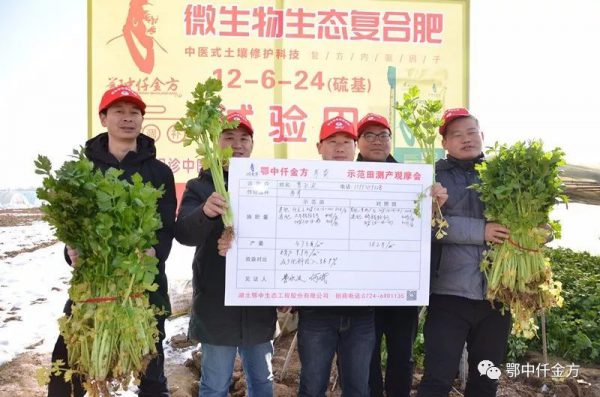 通過測產(chǎn)組、中醫(yī)養(yǎng)護隊員、新型職業(yè)種植大戶共同測產(chǎn)見證:示范田西芹單株株高平均比對照田高5公分;長勢均勻,成品率更高,葉莖更濃綠,葉柄寬厚,莖干粗壯,抽生花莖多,植株生長旺盛,大而濃密,葉柄未出現(xiàn)破裂;而對照區(qū)長勢強弱差別大,很多小株,葉柄破裂的多,根本沒法賣。折斷看橫切面,示范田西芹粗纖維少,細纖維多更豐富,質地更脆嫩,現(xiàn)場咀嚼芳香味濃,口感清脆,芹菜能當水果吃;現(xiàn)場檢測示范田西芹莖葉中所含的胡蘿卜素和維生素C比對照田西芹平均含量高0.4-1.2mg,品質更優(yōu)良,增加了西芹的營養(yǎng)和食療價值,能賣高價錢,現(xiàn)場樂壞了示范戶梁東獻,在場觀摩的其他種植大戶也紛紛表示一定得試試鄂中仟金方!