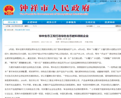 《農資與市場》.《中國新型肥料網》.《鐘祥市政府網站》.《北方農資》:鄂中生態工程打造綠色生態肥料領航企業